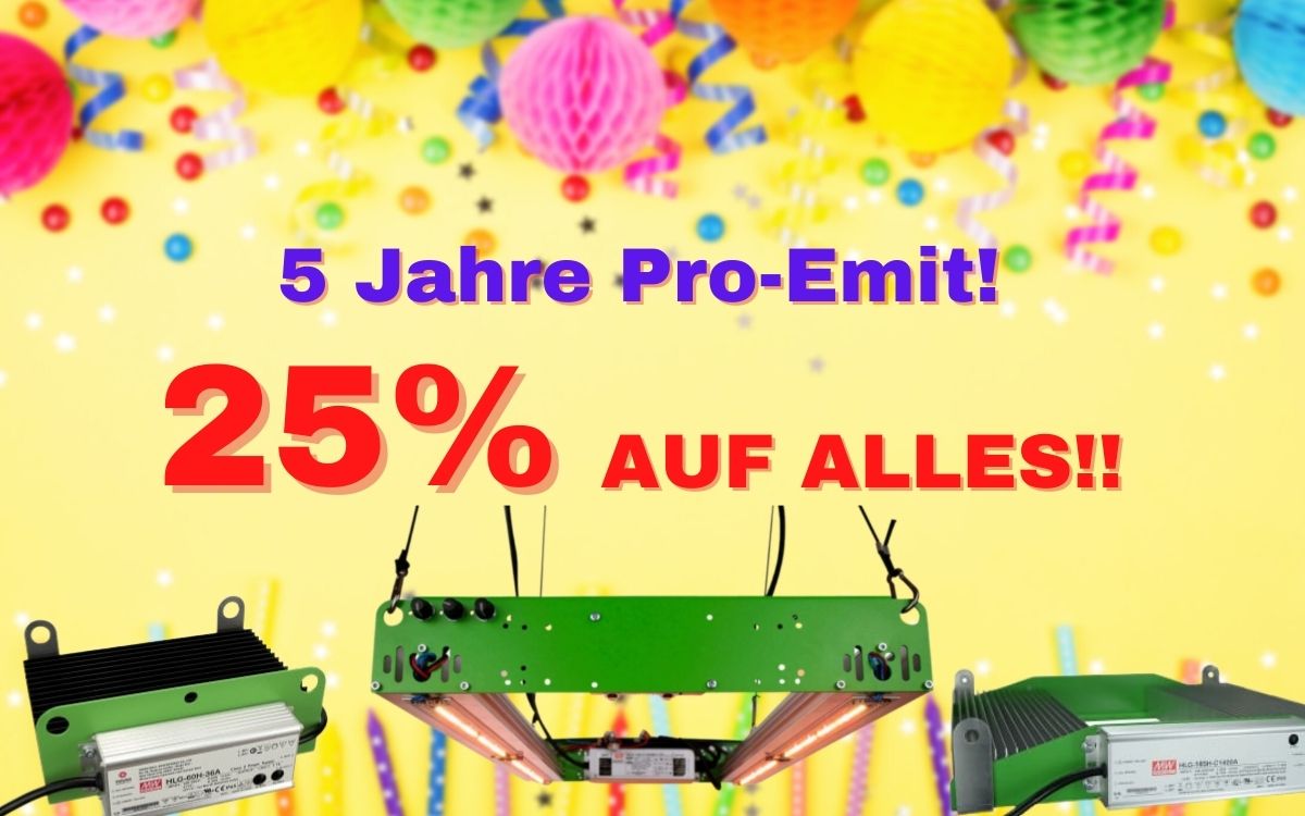 Happy Birthday Pro-Emit! Seit 5 Jahren sorgt Pro-Emit dafür, dass den Pflanzen ein Licht angeht und das alles mit der besten Qualität „Made in Germany“. Zum feierlichen Anlass gibt’s natürlich auch gleich die passende Aktion: 25% auf ALLES im Shop! Allerdings nur am Samstag, den 07.08.2021 und nur 1 Gutschein pro Kunde!