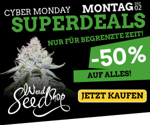 Bis zum 6. Dezember um 13 Uhr gibt es bei Seedsman gibt es jede Menge Strains als kostenlose Black Friday Beigabe. Je nach Bestellwert kann man aus 18 Sorten von 12 Breedern Bonus-Samen aussuchen. In 30 EUR Schritten bekommt man insgesamt bis zu 18 Seeds kostenlos.