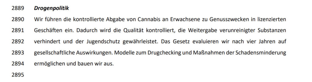 Der aktuelle Stand: Der Koalitionsvertrag beinhaltet die de-facto Legalisierung von Cannabis! Hier ist vor allem der Wortlaut „kontrollierte Abgabe“ interessant: