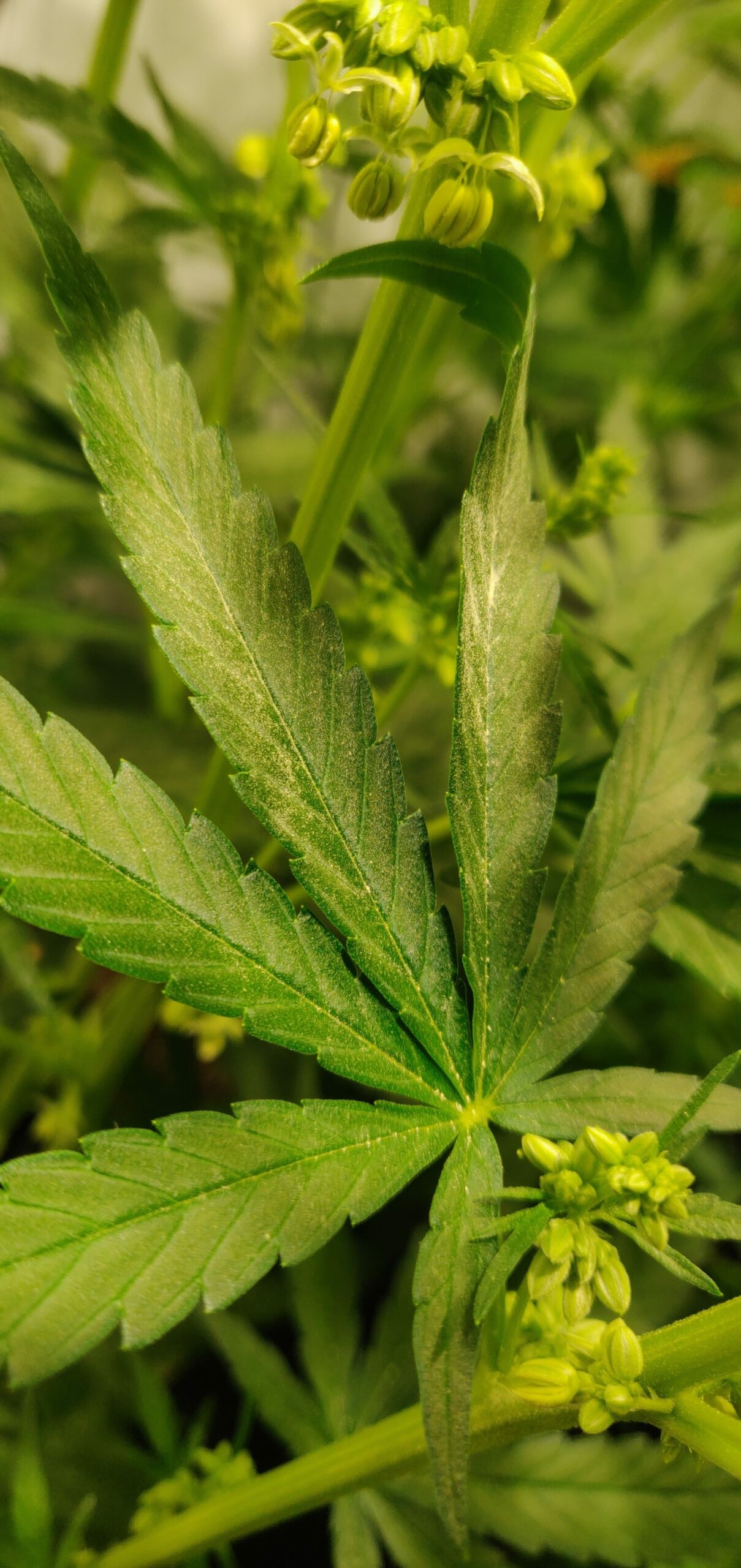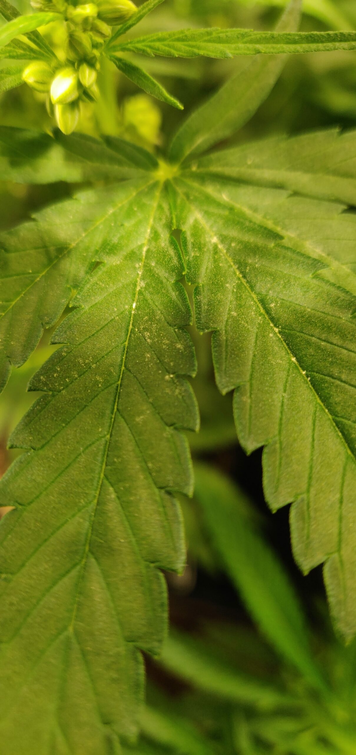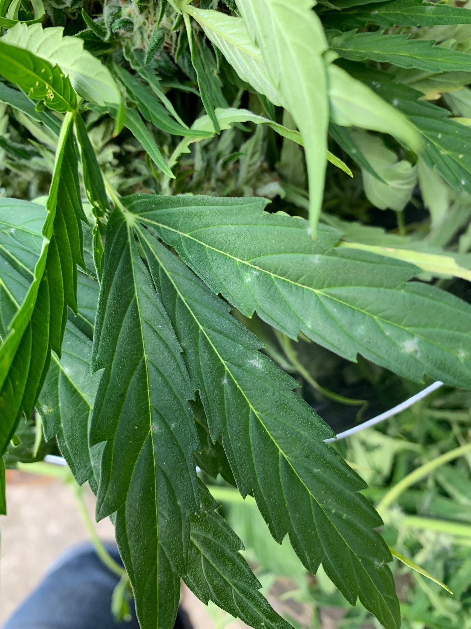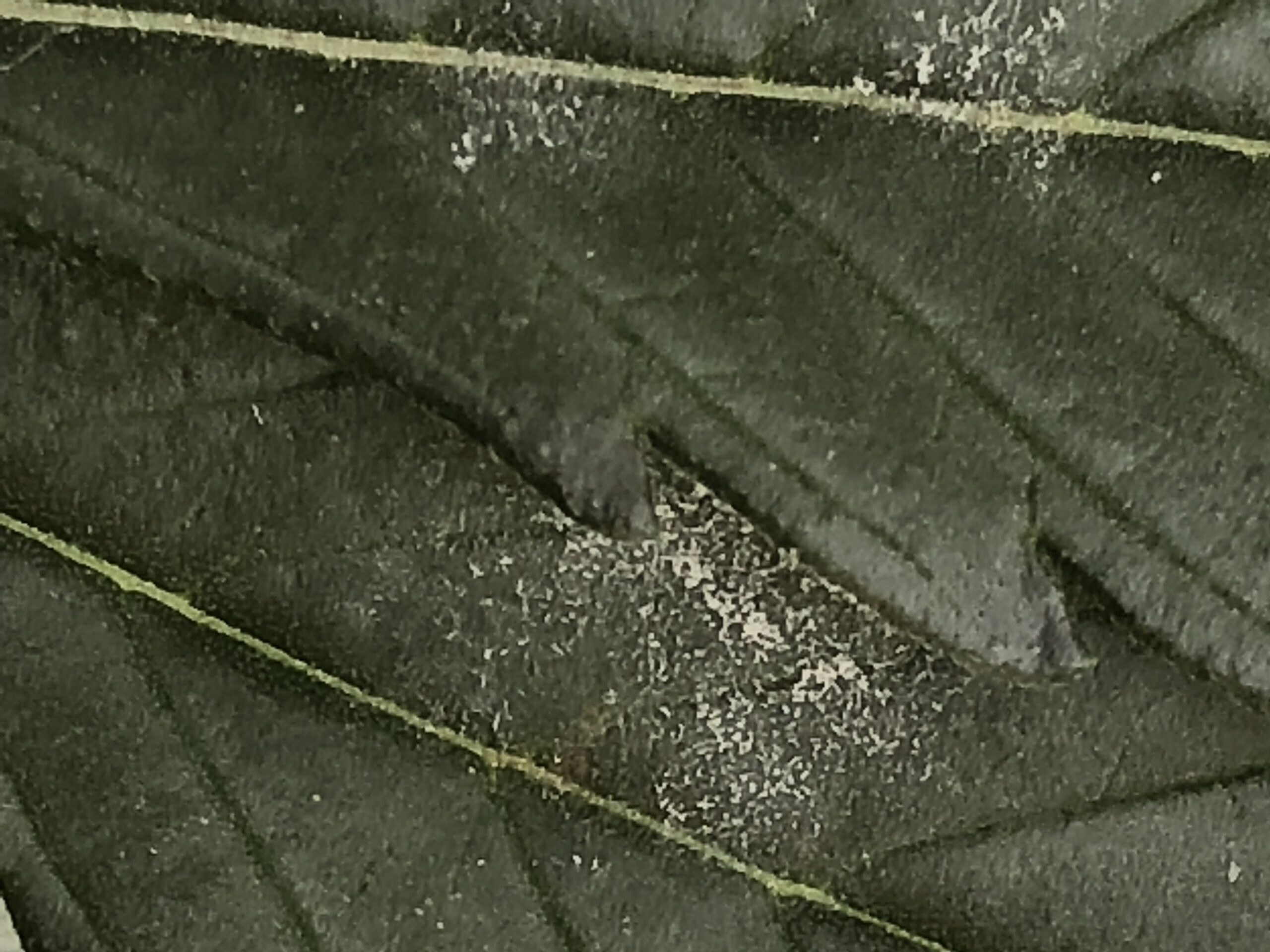 Beim Outdoor Anbau können Pollen von anderen Pflanzen auch schonmal wie Echter Mehltau aussehen. Pollen sind meist gelb und setzten sich großflächig auf den Blattoberseiten der gesamten Pflanze ab. Unten ist ein Beispielfoto von Pollen auf der Pflanze.