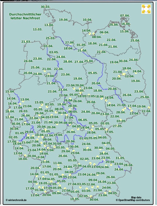 Unten ist die Deutschland-Karte für Durchschnittswerte des letzten Nachtfrosts jeden Jahres. Schaue nach ähnlichen Webseiten für deine Region oder dein Land und üb.
