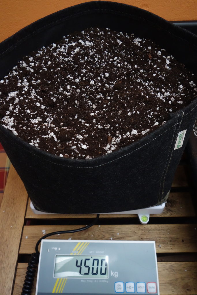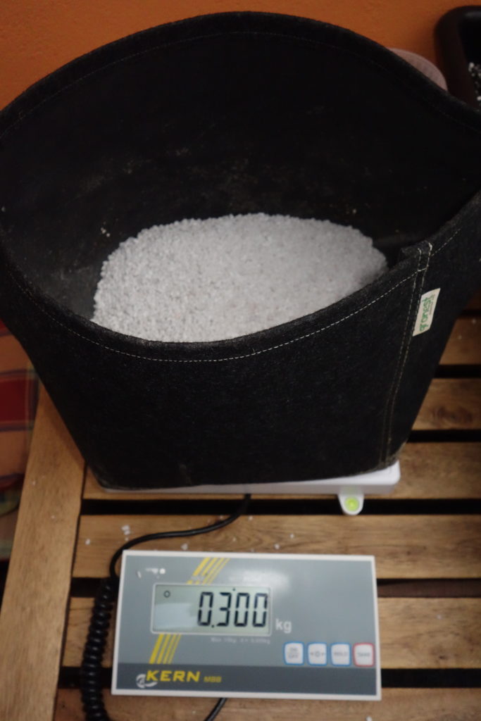 In unserem Beispiel hat unser Forumsherr Ruhr-Pot für seinen Automatic Grow den Perlit-Anteil der Plagron Light Mix Erde von 20 auf etwa 25 % erhöht. Zusätzlich hat er ein 15 Liter Gronest Stofftopf mit einer 300 Gramm Schicht Perliten gefüllt. Erst dann wurde jeder Topf mit Erde aufgefüllt, bis 4,5 Kilogramm auf der Waage standen. Damit vermeidet man vorab jeglichen Stress für die Pflanzen.
