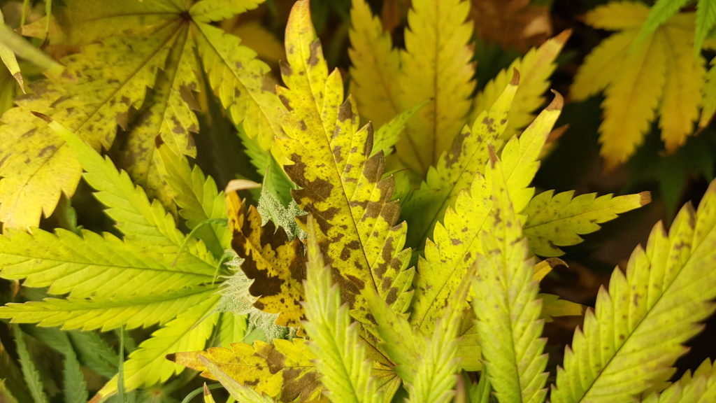 Man muss überprüfen, ob der Dünger zu viel Eisen oder Zink enthält. Falls das der Fall ist, muss man die Pflanze spülen und auf einen hochwertigen N-P-K Dünger wechseln. Beim organischen Dünger fängt man mit 50 % der Dosierungsempfehlung an. Beim mineralischen Dünger fängt man mit nur 20 % an. Danach kann man Pflanze beobachten und langsam steigern.