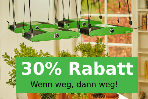 Der Ausverkauf der beliebten Profi sunflow Leuchten von Pro Emit kommt zeitgleich mit der Feier zum 420. Zufall? Wir glauben’s mal nicht! Wer schon immer mal eine der besten Grow Lampen auf dem Markt sein Eigen nennen wollte, kann jetzt kräftig sparen: Einen massiven 30% Rabatt gibt es auf die sunflow und die sunflow PRO Leuchten. Verpennen sollte man aber nicht, denn das Angebot gilt nur solange Vorrat reicht!