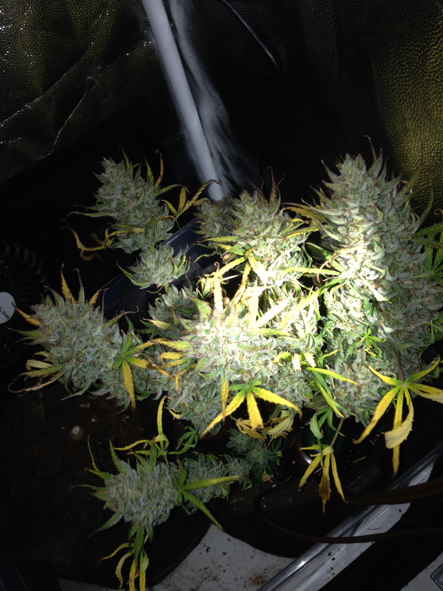 Sobald man die Pflanze zur Einleitung der Ernte spült (Flushing), werden jede Menge Blätter Stickstoffmangel erleiden und stark verwelken. Unten sind Fotos von Pflanzen zum Ende der Blütephase, die einen normalen Stickstoffmangel haben, der nicht behandelt werden muss.