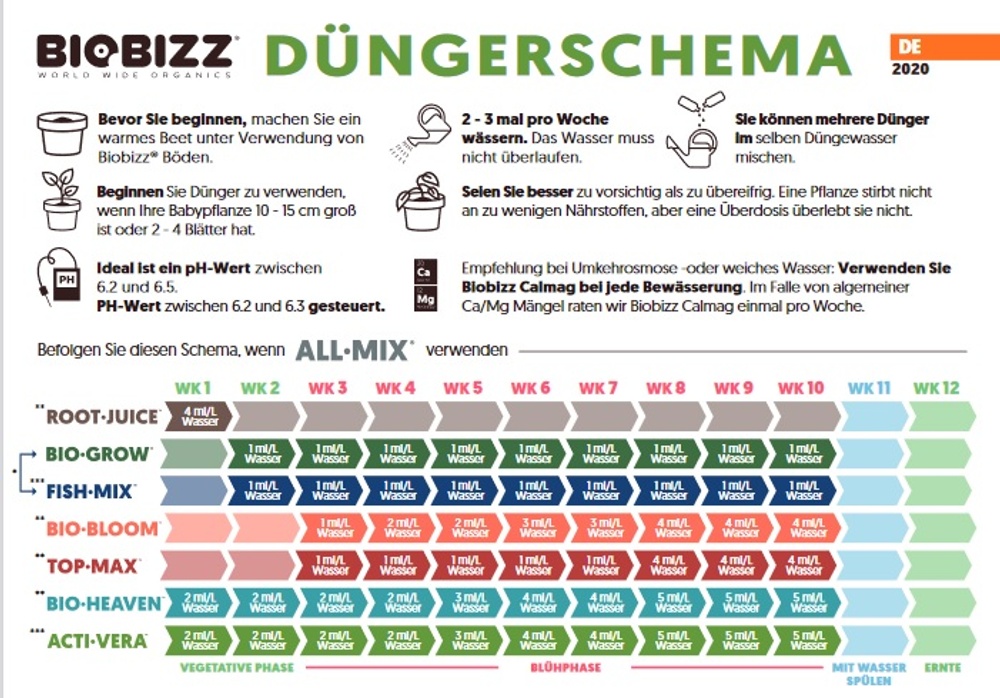 ACHTUNG: Das vom Hersteller empfohlene Düngerschema ist nicht nur teilweise missverständlich, wir raten sogar von manchen Ratschlägen komplett ab, da es möglicherweise zu Mangelerscheinungen kommen kann! In unserem Indoor Growguide haben wir ein speziellen Abschnitt, indem wir ein von uns angepasstes BiobIzz Düngerschema für die Community entwickelt: https://staging.cannabisanbauen.net/themen/biobizz-angepasstes-schema