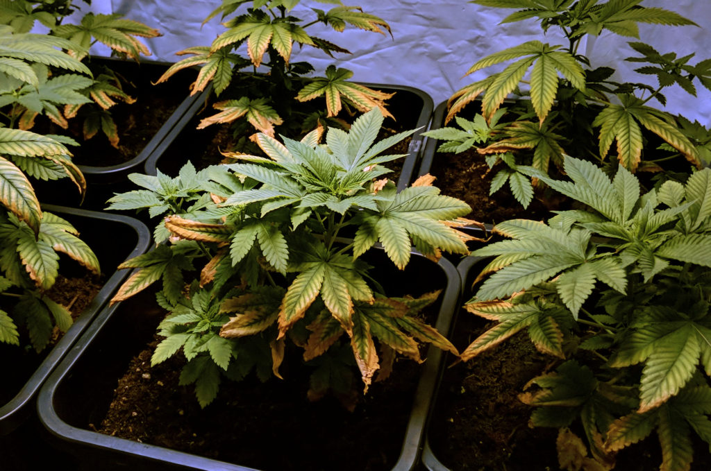 Baut man mineralisch an und man verwendet in der Blüte fälschlicherweise Wachstumsdünger, führt man der Pflanze zu viel von diesem Element zu. Es kommt zu einem Stickstoffüberschuss. In der späteren Blüte benötigt Cannabis nämlich weitaus weniger Stickstoff als in der Wachstumsphase (Vegi).