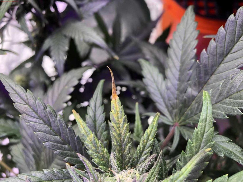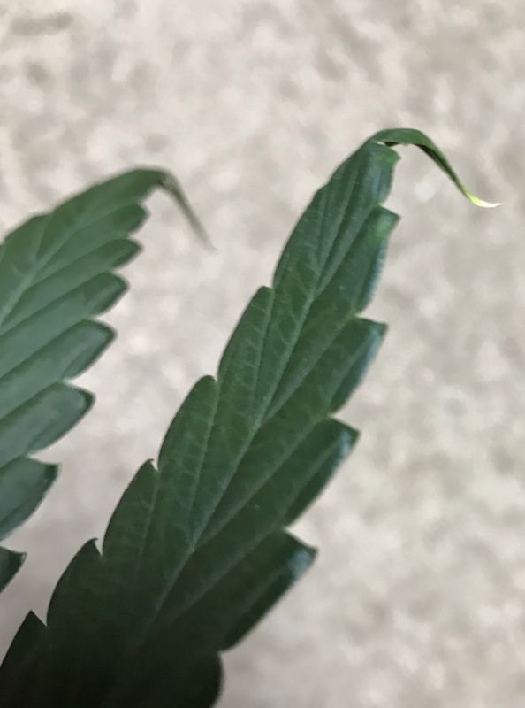 Zusätzlich zu der dunklen Verfärbung der Blätter kann es auch passieren, dass sich die Spitzen der Blätter einrollen. Ähnlich wie bei den Symptomen von Überwässerung biegen sich die Spitzen der Blätter nach unten und formen eine „Adlerkralle„. Kann man Überwässerung mit Sicherheit ausschließen, dann ist das Runterbiegen der Blätter ein Indiz für einen Stickstoffüberschuss.