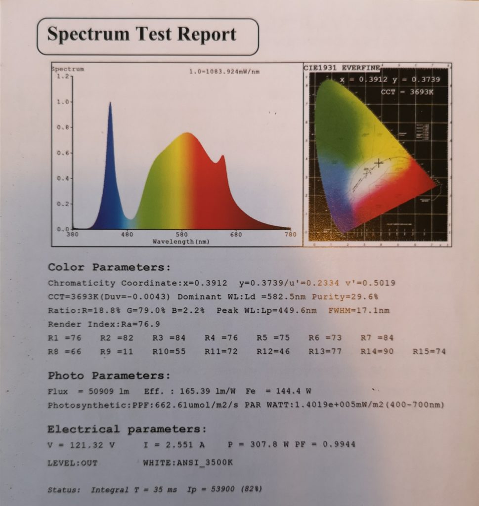 Wie hier gut zu erkennen ist, ist auch ein signifikanter Anteil an IR Strahlung enthalten sowie massive Blauwerte. Diese Blauwerte verhelfen den Pflanzen zu einem starkem Wuchs. Die Infrarot-Strahlung trägt zur Entwicklung von potenteren Pflanzen bei.