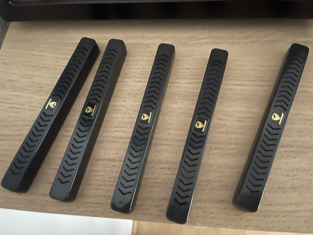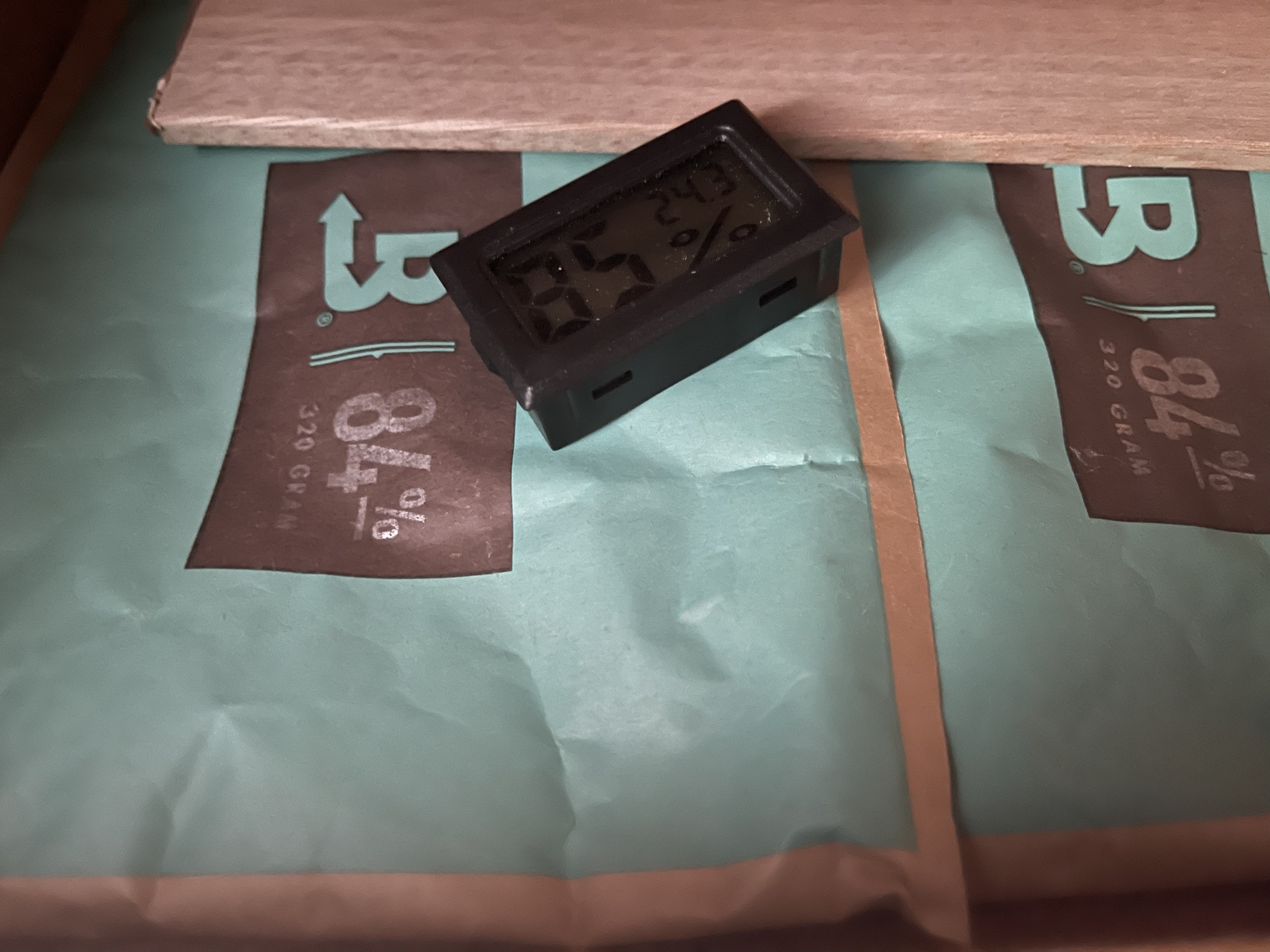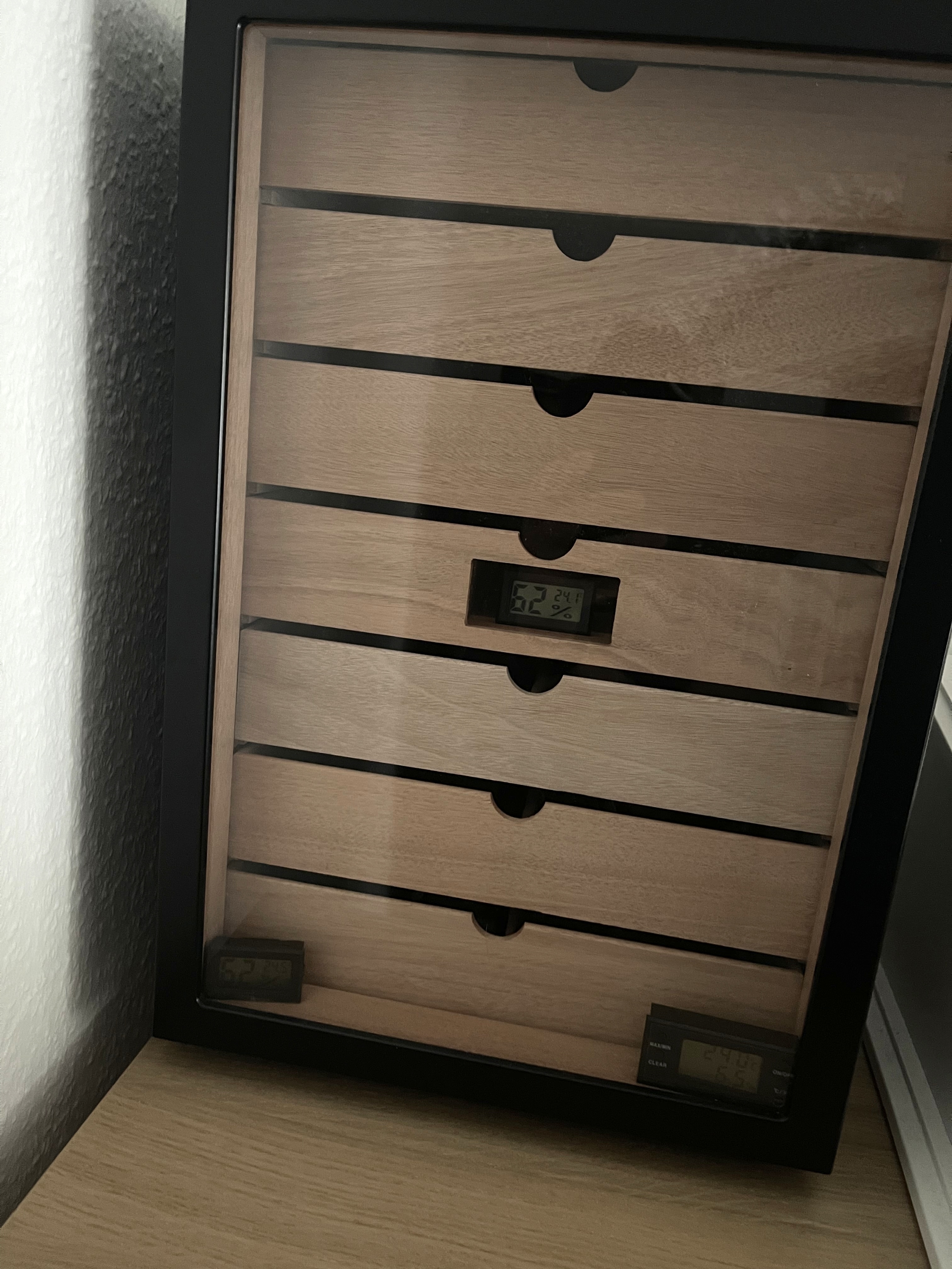 Anfangs habe ich die mitgelieferten Kristallbefeuchter nur übergangsweise eingelegt. Für das eigentliche Einfahren habe ich 2x 84% 320g Boveda Päckchen bestellt. Dann habe ich etwa drei Tage später bei jetzt schon 45% Luftfeuchtigkeit (RLF) die Kristallbefeuchter gegen die Bovedas ausgetauscht. Jetzt heißt es warten laut Bedienungsanleitung. Man soll 14 Tage lang den Schrank nicht öffnen, das habe ich auch getan.