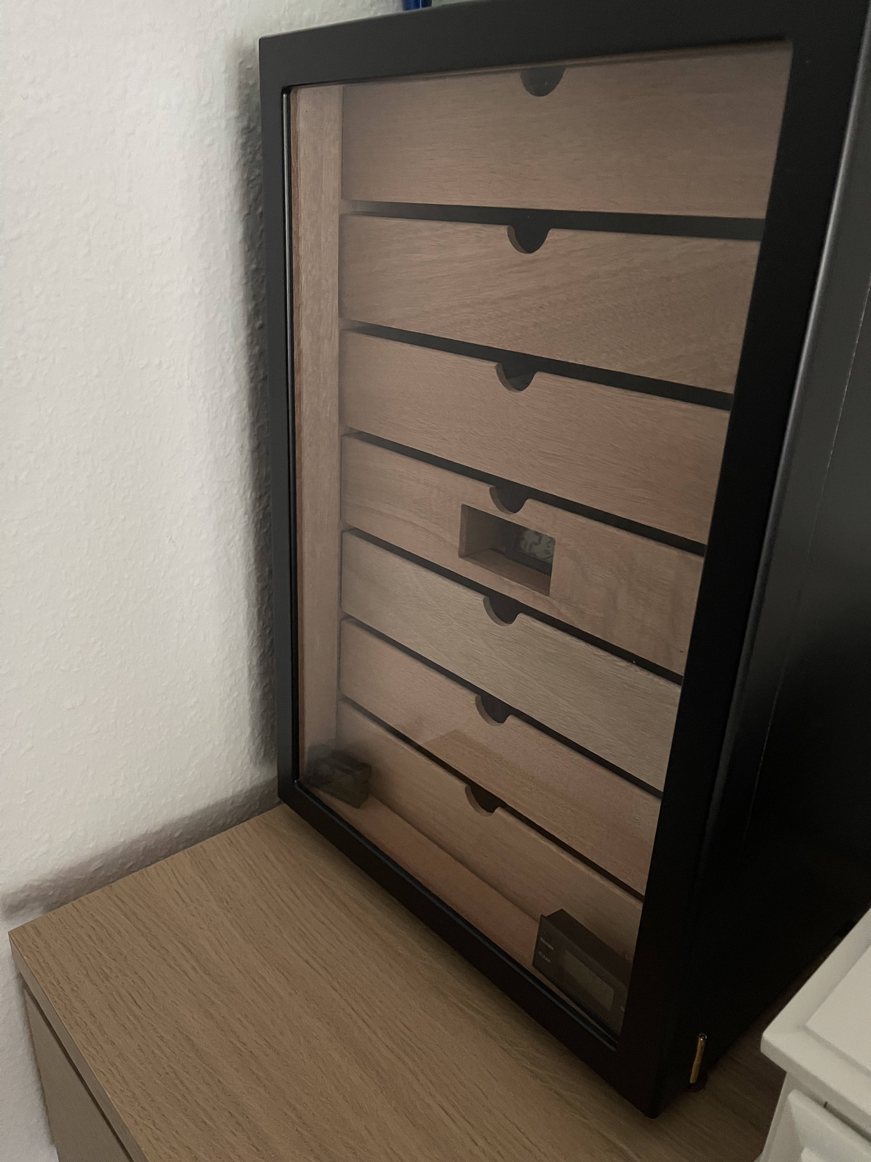 Zum Lüften habe ich in der ersten Woche die beiden Schubladen herausgenommen, jeweils immer für 10 Minuten am Tag. Dabei habe ich im folgenden Schema gelüftet: Nach der ersten Woche alle drei Tage für 5 Minuten. Nach etwa 3 Wochen sporadisch nach Lust und Laune (*gar nicht mehr nur wenn ich was zum Rauchen raus hab*).